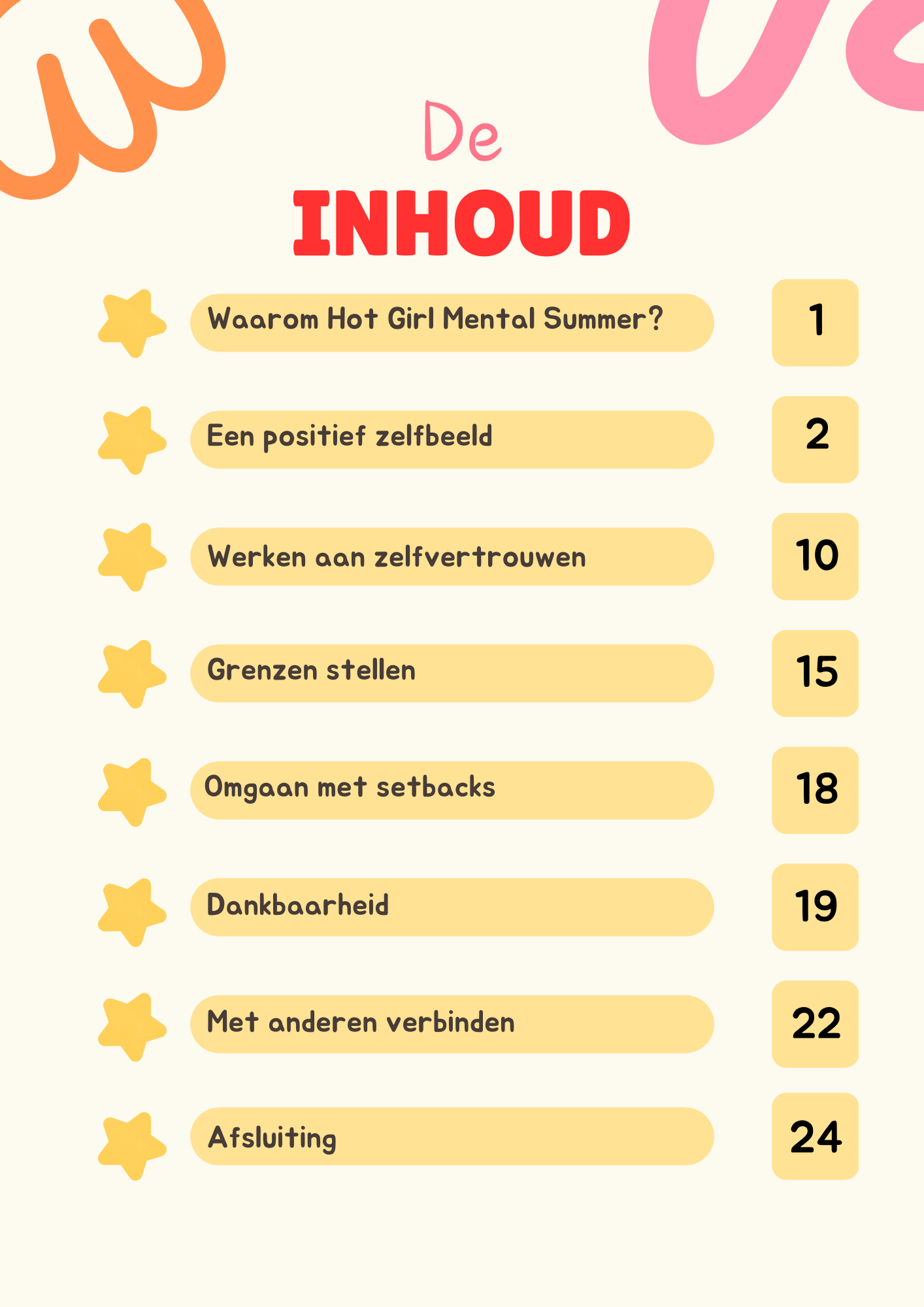 Hot Girl Mental Summer is hét online werkboek dat gaat over het worden van de beste en sterkste versie van jezelf; maar dan mentaal. Zodat je (hopelijk) optimaal kunt genieten van die welverdiende zomer dagen. In dit e-book gaan we o.a. aan de slag met wat een positief zelfbeeld is, hoe jij gezonde grenzen stelt en hoe je omgeving bijdraagt aan jouw ontwikkeling. Naast erover lezen, krijg je dus ook handvaten aangeboden om zelf aan de slag te gaan met de tips die ik je geef.